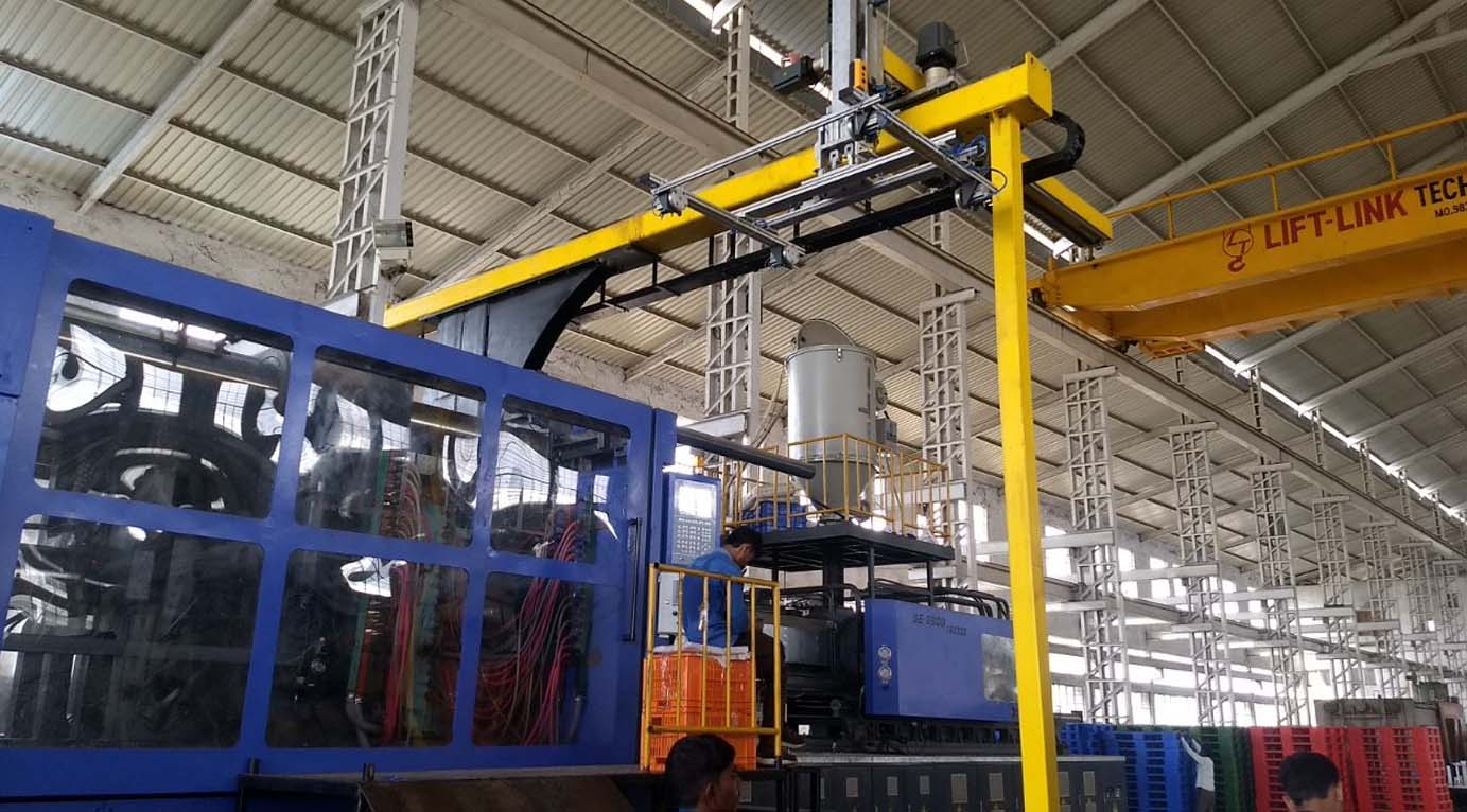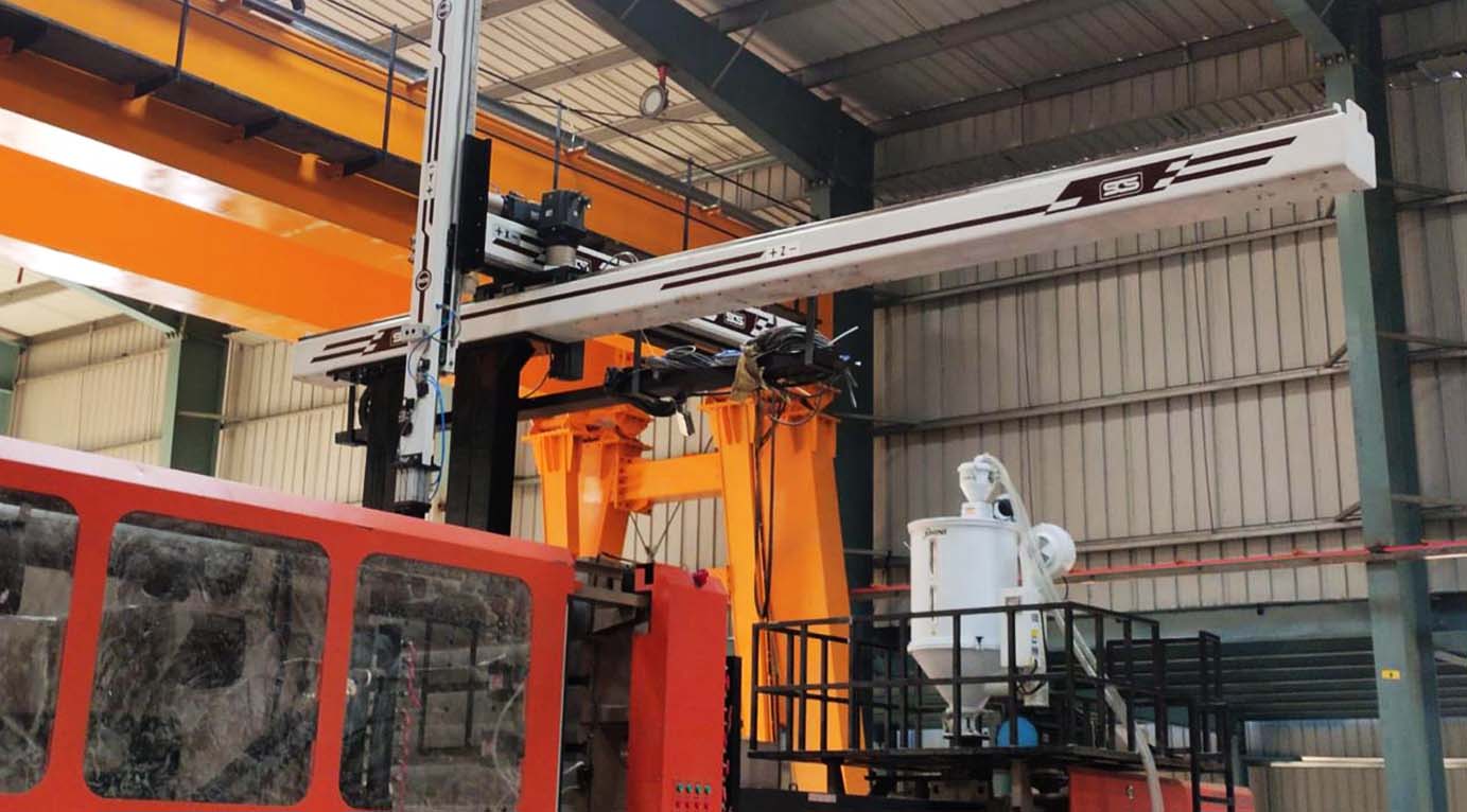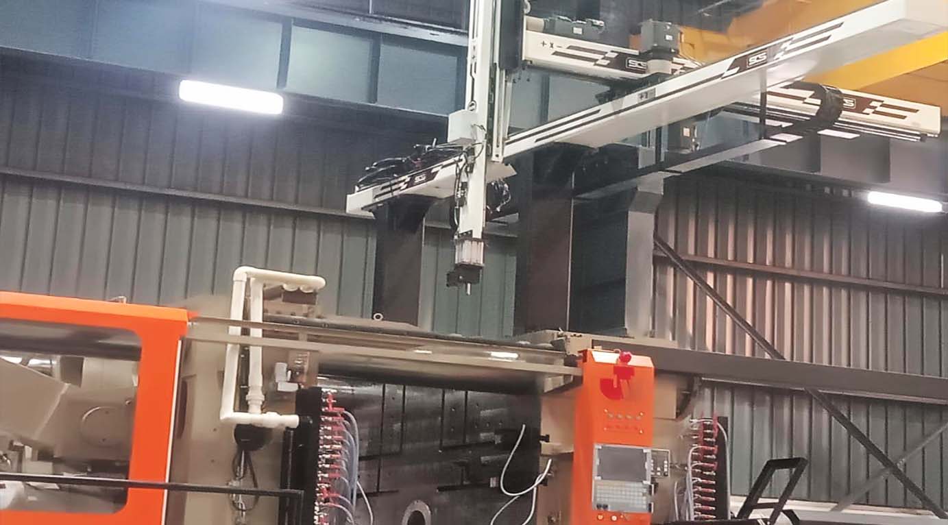 They have a vertical Y axis to reach into the space between the molds; an Z axis defined by the horizontal beam to reach from an area above the mold to a point outside the machine; and a X axis that moves the vertical arm in-line with the injection molding machine to strip parts off the mold or position them outside the molding area.
