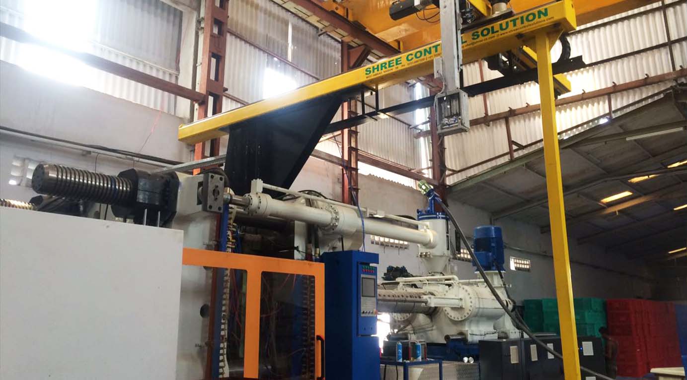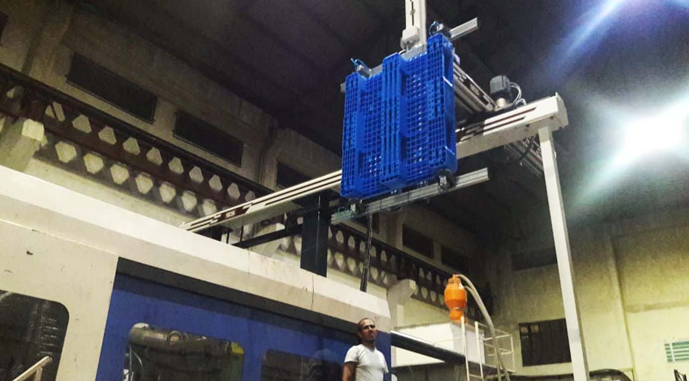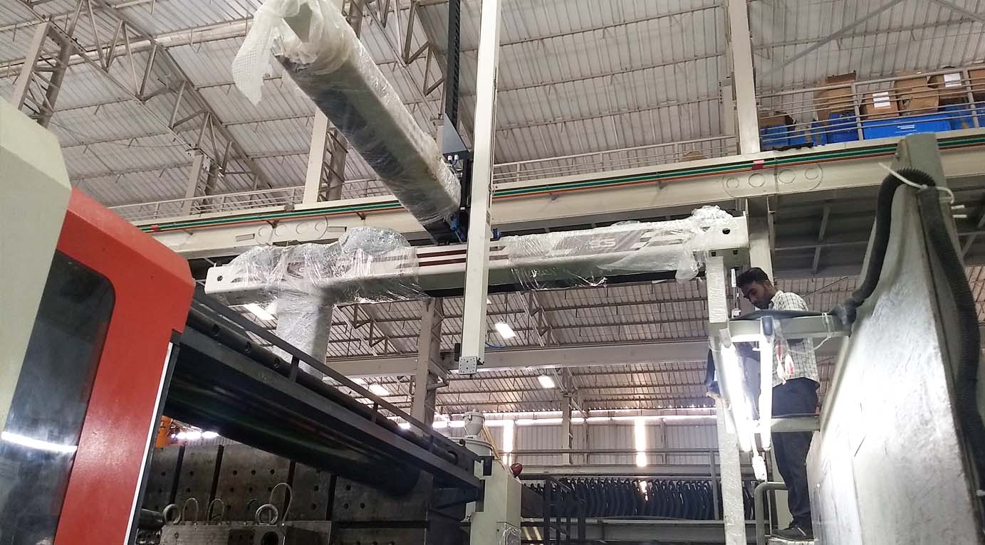 They have a vertical Y axis to reach into the space between the molds; an Z axis defined by the horizontal beam to reach from an area above the mold to a point outside the machine; and a X axis that moves the vertical arm in-line with the injection molding machine to strip parts off the mold or position them outside the molding area.